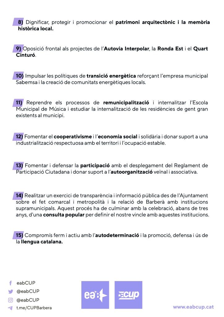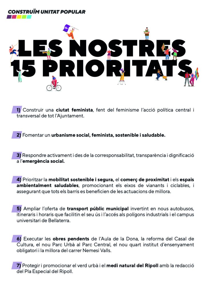 2023-2027 Un programa pel mandat 2023-2027 que marca una clara línia de treball i que suposen 118 compromisos amb la nostra ciutat: Programa 2023-2027Baixa I coneix les nostres 15 prioritats per aquests propers 4 anys. Suma’t a l’alternativa!