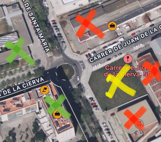 (en groc, solar on volen fer una benzinera; en vermell, empreses privades que són informades activament i amb carta certificada; en verd, escola i llar d’infants i comunitats veïnals del Parc Europa ignorades i discriminades en la fase legal d’informació pública)
