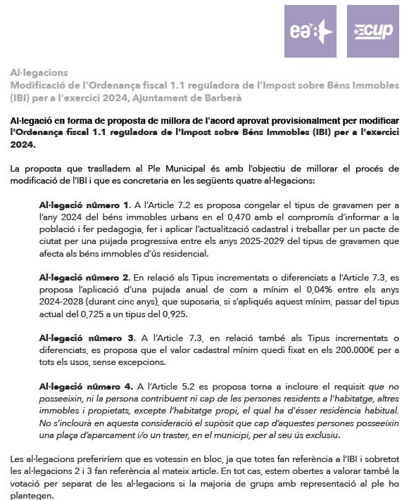 La presentació d’al·legacions es fa després no tenir cap mena de retorn per part del govern municipal un cop fetes públiques i traslladades les propostes sobre l’IBI de l’EAB-CUP el passat mes d’octubre i exhaurint el temps d’informació pública de la modificació de l’IBI pactada en silenci i opacitat entre el PSC, PCPB i ERC. I la presentació de la Proposta d’Acord “40/60” es fa per mirar de forçar un debat públic al voltant de la modificació de l’IBI i obrir una oportunitat per treballar per un pacte més ampli d’esquerres a la nostra ciutat en matèria d’impostos municipals i que vagi més enllà d’un mandat.